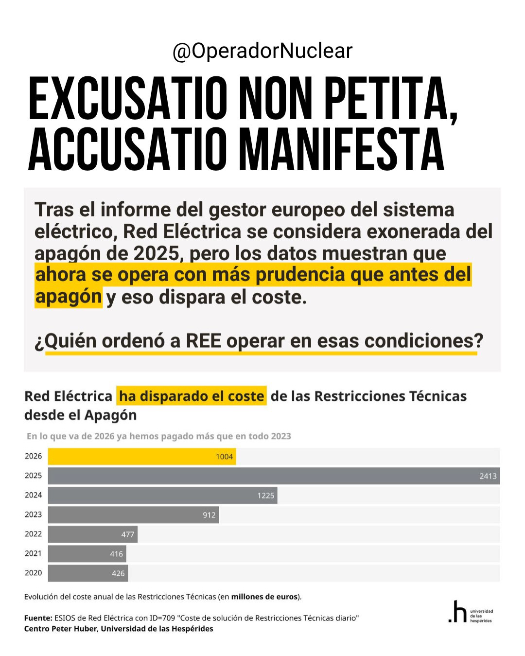 Že na této hypotéze něco bude, o tom svědčí činnost provozovatele soustavy především v týdnech a měsících po 28. dubnu, ale do značné míry i v období trvajícím až do současnosti: REE zavedla tzv. „posílený“ režim, který připouští častější a intenzivnější krácení výroby OZE a zároveň umožňuje dostat do hry víc klasických (hlavně plynových) elektráren mimo trh. Proč by to jinak dělala, kdyby tyto aspekty nehrály roli? Fakt by si to provozovatel soustavy lajsnul „jen tak pro jistotu“, když ta legrace stojí španělského spotřebitele minimálně miliardu eur ročně?