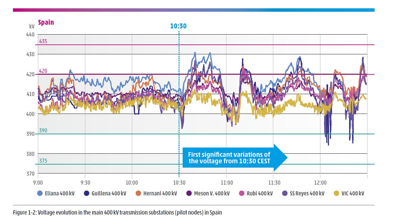 A nakonec jedna španělská specialita. Není to paella ani gazpacho, ale specifické pravidlo, které umožňuje soustavě ve Španělsku pracovat v širším napěťovém rozsahu než v jiných zemích EU. Zatímco v Česku se už při 420 kV spouští přepěťová ochrana, ve Španělsku byly hodnoty do 435 kV přípustné nejen v rámci nouzových stavů, ale i za normálního provozu. Nebýt tohoto zdánlivého detailu, soustavu by v den D možná postihlo jen pár lokálních (a relativně snadno řešitelných) problémů. Nízká (či spíše žádná) rezerva mezi napěťovým limitem a tvrdou odpojovací hodnotou však vedla k jednomu opravdu velkému problému.