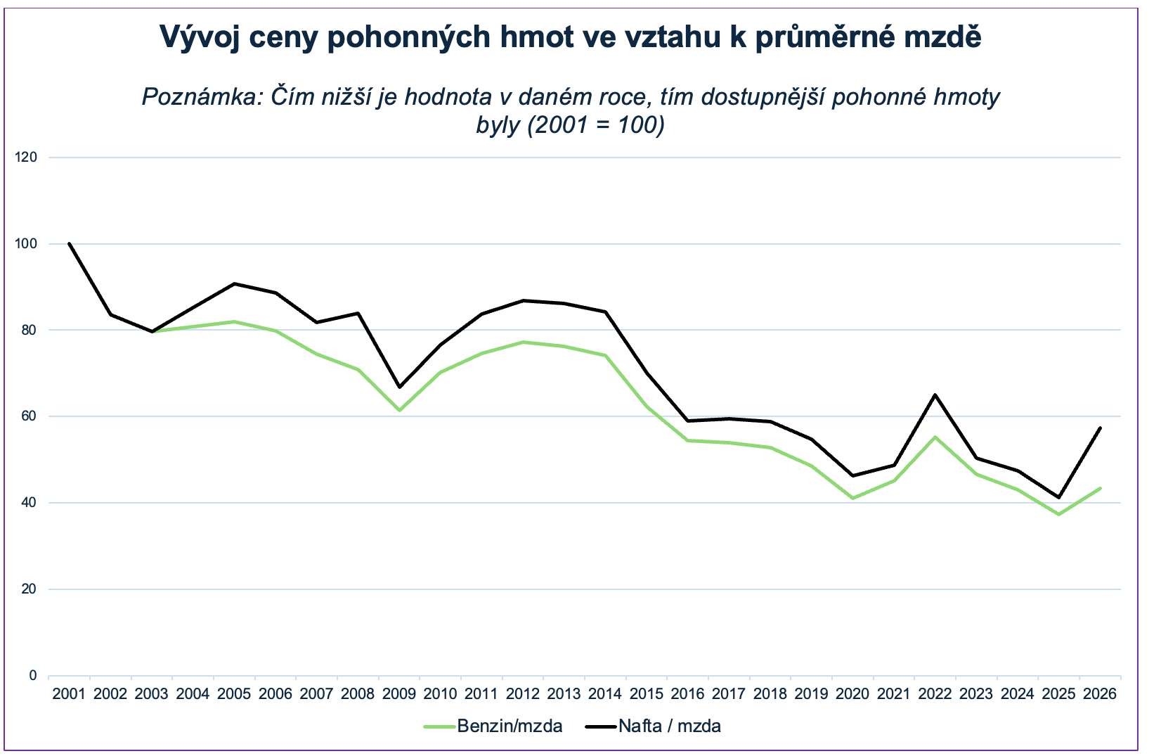 Poznámka: Graf zobrazuje index dostupnosti pohonných hmot ve vztahu k průměrné mzdě (základ = 2021 = 100). Nižší hodnota indexu znamená vyšší dostupnost dané pohonné hmoty. Graf slouží ke srovnání vývoje dostupnosti v čase, nikoli k přímému porovnání cen mezi benzínem a naftou – nelze z něj tedy usuzovat, že jedna komodita byla levnější než druhá. Pro současný stav uvažujme cenu 41 Kč za litr benzinu a 48 Kč za litr nafty. U let 2001 až 2025 je cena vypočítána jako průměrná cena v daném roce, pro rok 2026 je ilustračně zanesena cena z 1. poloviny dubna.