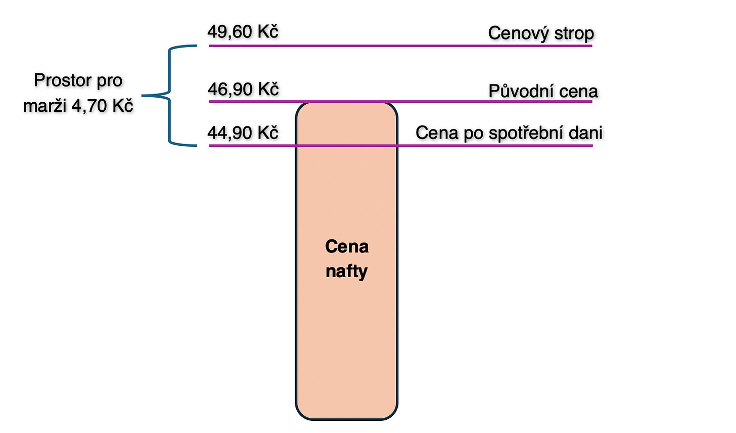 Pro přehlednost – vláda se rozhodla zastropovat marže benzinu a nafty na 2,50 Kč, a současně dočasně snížit spotřební daň na naftu o 2 Kč na litr. Marže pumpařů mají být regulovány tak, že Ministerstvo financí každý den zveřejní informaci o maximální ceně PHM. Výsledek? Ne ochrana spotřebitelů, ale učebnicová ukázka škodlivosti regulace.