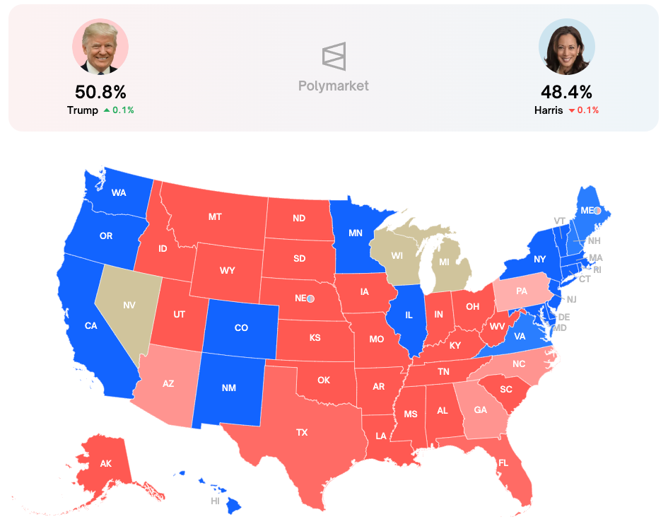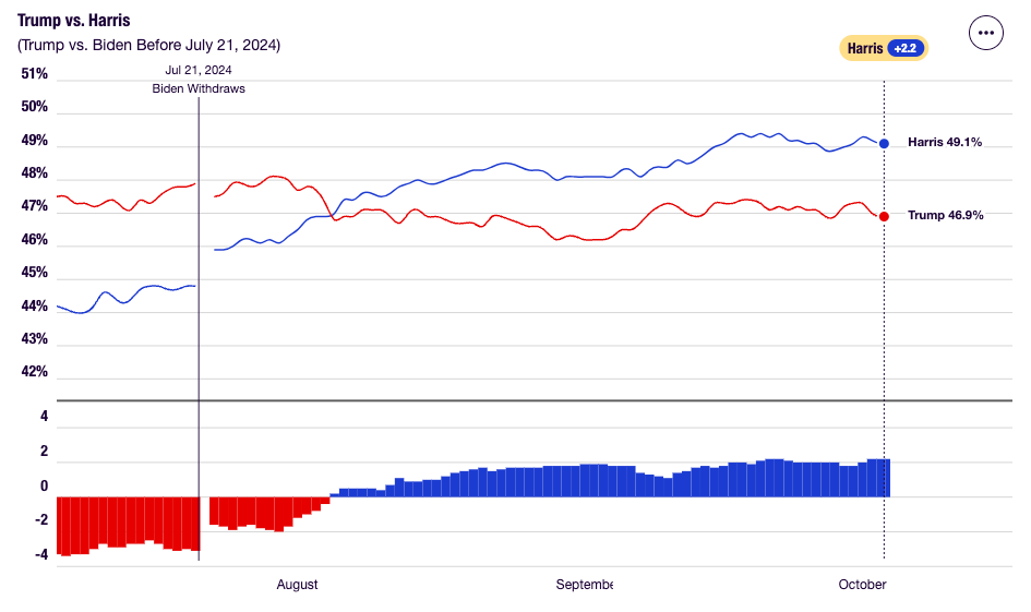 Podle sázkařského agregátoru RealClearPolitics je to aktuálně 49,1 % vs. 46,9 % ve prospěch Harrisové.