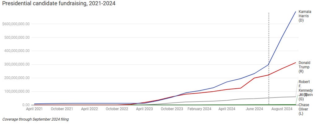Harrisová má nicméně zatím zásadní výhodu v donátorech a množství prostředků, které na kampaň vybrala. Zatím…