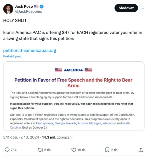 S preferencemi totiž může ještě ve velkém zahýbat dění uplynulého víkendu. Elon Musk totiž vystoupil vedle Donalda Trumpa na jednom z předvolebních meetingů a navíc zahájil masivní kampaně. Jeho America PAC totiž chce dát za každého registrovaného voliče těžko uvěřitelných 47 dolarů (přes 1000 korun).