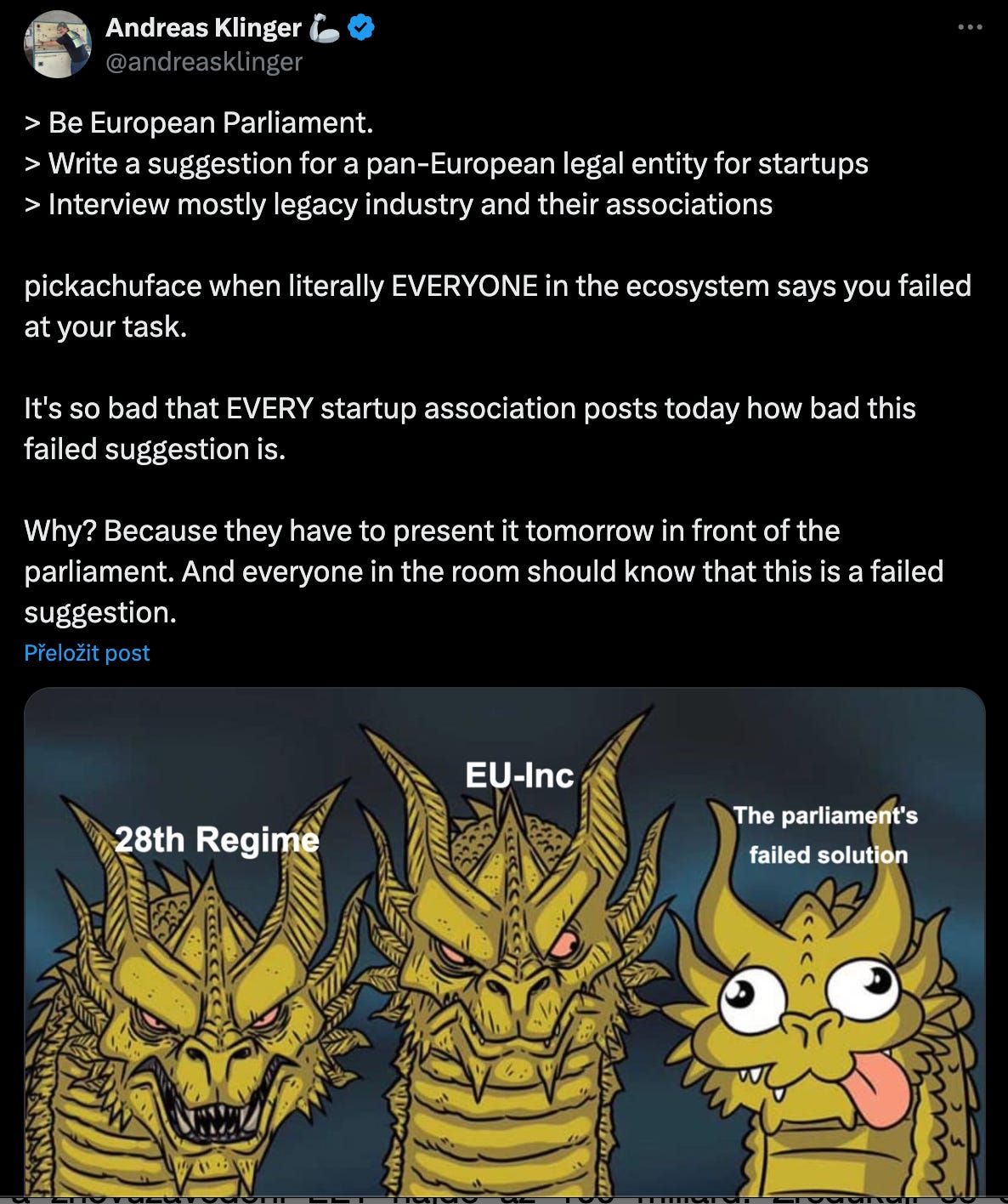 Repasiho ESSU návrh navíc nebyl dostatečně konzultován se startupovou komunitou přes AFS nebo EU Inc. Důvodem jsou pravděpodobně výše zmíněné politické preference – priorita byla dána aktérům, kteří jsou tradičně politicky bližší frakci S&D a národním reprezentacím členských států (seznam konzultovaných entit je veřejně k dispozici). Startupové komunitě se tento ‚o nás bez nás’ přístup pranic nezamlouvá, a důrazně se tento týden hlásí o slovo.