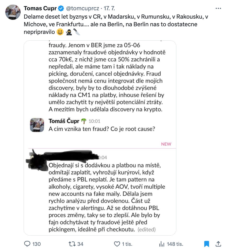 Tohle je pro fajnšmekry z e-commerce, ovšem Tomáš Čupr zveřejnil zajímavý pohled do toho, co třeba musí řešit Rohlík v Berlíně.