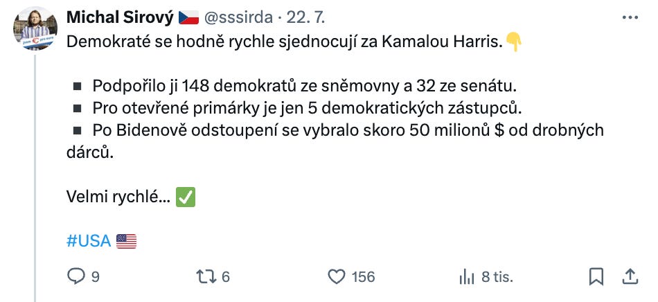 Bylo zajímavé, že Biden svoje oznámení o odstoupení nespojil přímo do jednoho sdělení s tím, že podporuje Kamalu Harris (byly to dvě oddělené zprávy, krátce za sebou), ale vypadá to, že je v podstatě jasno. Nebo si umíte představit, že by Demokraté vyrukovali ještě s úplně jiným jménem?