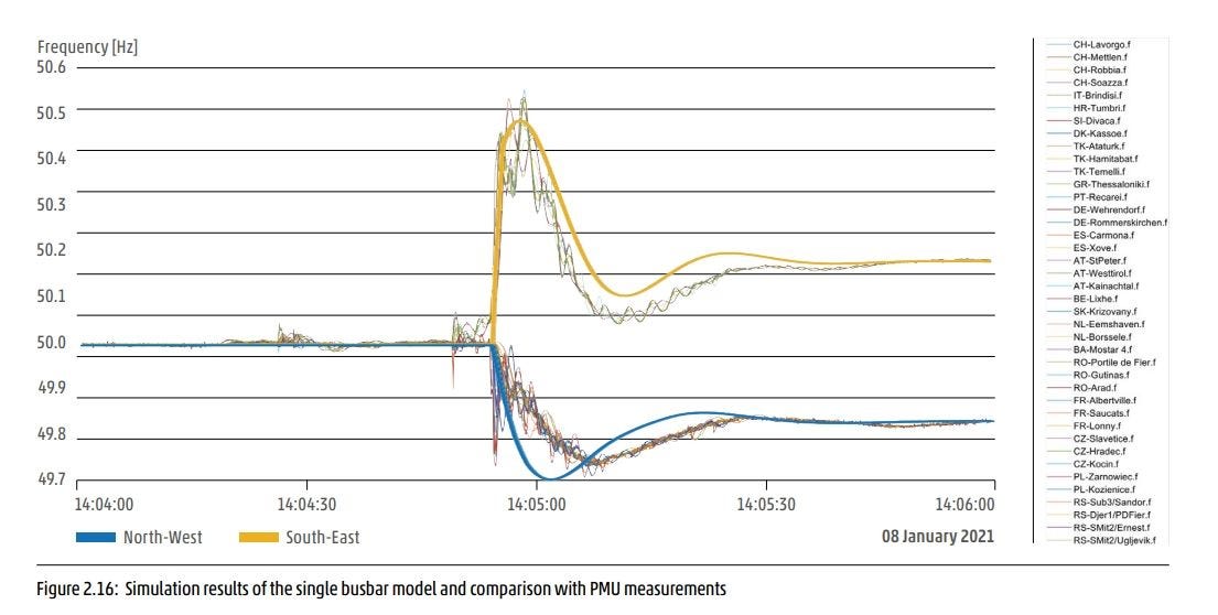 Výsledek byl spektakulární a jsem docela rád, že si můžu dovolit použít právě toto slovo (kontinent zůstal rozsvícený, takže bylo co sledovat). Evropská soustava se rozdělila na dva ostrovy, přičemž v tom severozápadním spadla frekvence na 49,74 Hz a v jihovýchodním vyletěla na 50,6 Hz. Což byl přímý důsledek toho, že v severozápadním ostrově chyběly asi tři Temelíny a v jihovýchodním přebývaly. Nejviditelnějším důsledkem situace bylo nouzové odpojování fabrik ve Francii a Itálii (což samo o sobě skoro vykompenzovalo jeden z chybějících Temelínů).