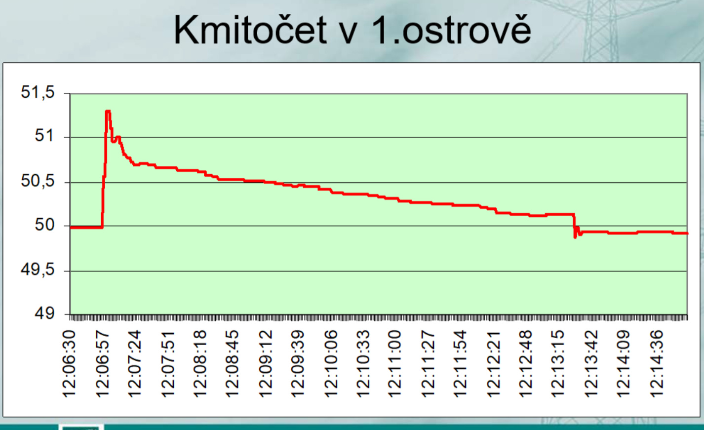 Když se v 15:05 Kolínsko a spol. rozloučilo s přenosovkou, zahýbalo to s frekvencí a elektrárna se automaticky přepnula do režimu regulace ostrovního provozu, v němž po obchodnících a dispečerech přebírá vládu nad elektrárnou právě frekvence v síti. To ale nebylo všechno, „Chvalky“ totiž skočily rovnou do energetického ostrova, a musely se tedy udržet na otáčkách a vlastní spotřebě pomocných prvků. Protože v první chvíli byla spotřeba ostrova asi o 100 MW nižší než souběžná výroba elektrárny, frekvence šla nahoru a certifikované řídicí systémy domlouvaly turbíně a generátorům, aby se tolik nerozvášňovaly.