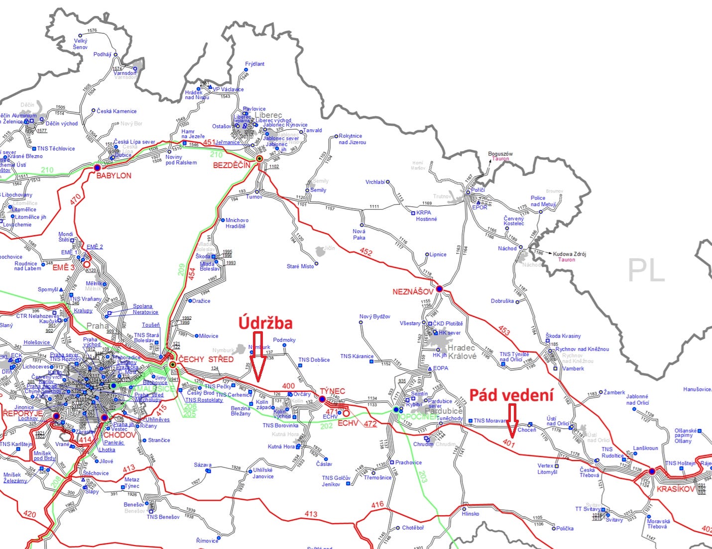 Učebnicový oslí můstek (kolem projel tleskající Miloš Zeman): Žhavá byla i středa 12. června 2019, které bylo úplně jedno, že formálně spadá do pozdního jara, a chovala se jako nefalšovaná letní středa. Což dost otrávilo izolátor, který odděluje fázové vodiče od stožáru na přenosové lince V401 Týnec – Krasíkov. Takže když do něj ještě navíc foukl silný vítr, řekl si: A dost, vážení, já padám! Bylo to od něj teda dost nezodpovědné, protože na navazující lince V400 Čechy-střed – Týnec právě probíhala plánovaná údržba, takže ji nebylo možné využít jako alternativu.
