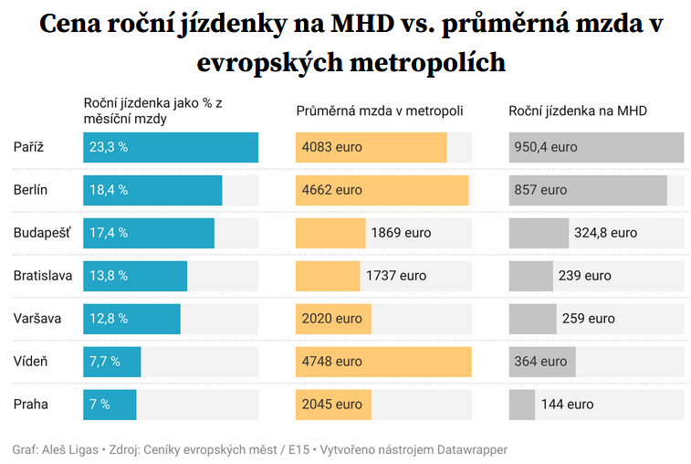 Problémů je zde celá řada, ale je třeba říci, že se tu podařilo vybudovat efektivní systém veřejné hromadné dopravy, zejména té nadzemní. I tak ale dostáváme za málo peněz hodně muziky. Pražská MHD je mezi evropskými metropolemi jedna z nejlevnějších při přepočtu na mzdu, jak ilustruje graf z E15. Velmi levně jezdí Pražané i v porovnání s dalšími českými krajskými městy.