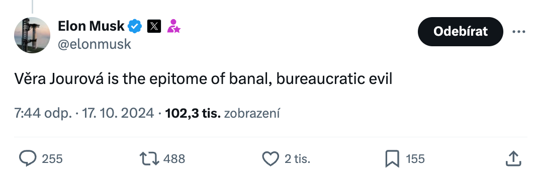 Je to nejspíš správný moment pro to, aby Věra Jourová napadla Elona Muska jako „propagátora zla”. Když srovnáme výsledek činnosti posledních deseti let obou osobností, nevychází to dobře pro Věru Jourovou.