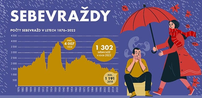 Skvělé reakce máme taky na díl s psychiatrem Jiřím Horáčkem. Jdeme v něm hodně hluboko do příčin krizí v dnešní společnosti. Probrali jsme vliv sociálních sítí a dopady covidu na mentální zdraví Čechů i otázku, zda společnosti nechybí smysl života. Hodně jsme si povídali i o datech kolem sebevražd. Tady je kontext v grafice od Českého statistického úřadu.