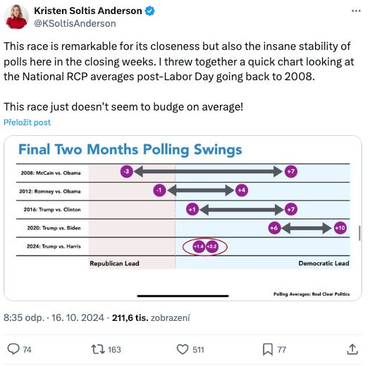 Jak to tedy aktuálně vypadá v Americe? Bez výraznějšího favorita, ani tři týdny před volbami. Podrobně jsme se věnovali věcem souvisejícím s volbami i v nedávném newsletteru.