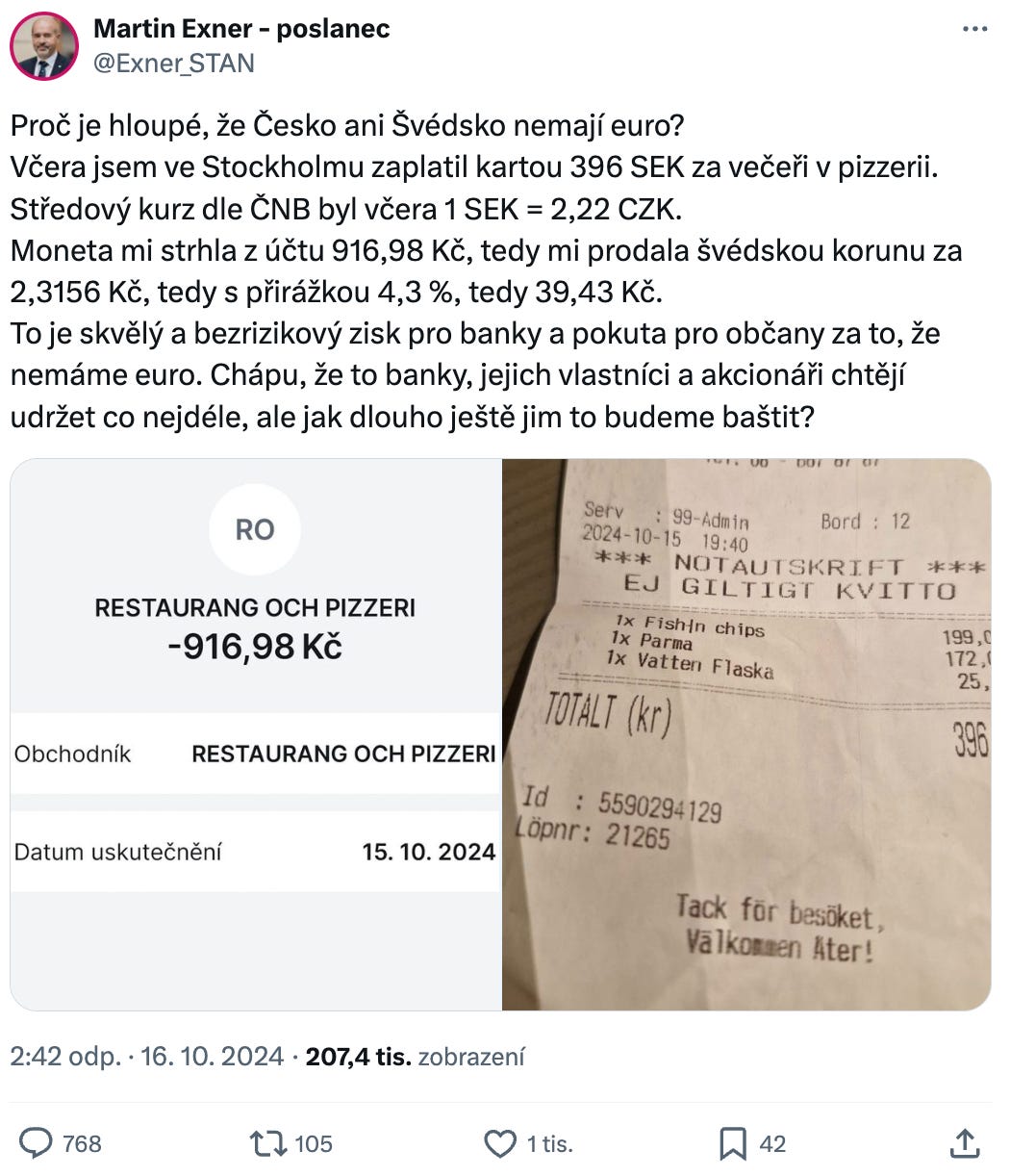 Je z toho samozřejmě obvyklá óda na nejzbytečnější téma české veřejné debaty - zavedení Eura (nejen v Česku, ale i ve Švédsku). Normální člověk už roky používá Revolut a téma neřeší, ale kdo jsme my, obyčejní podnikatelé bez automatické valorizace platů, abychom radili těm nahoře 🙂